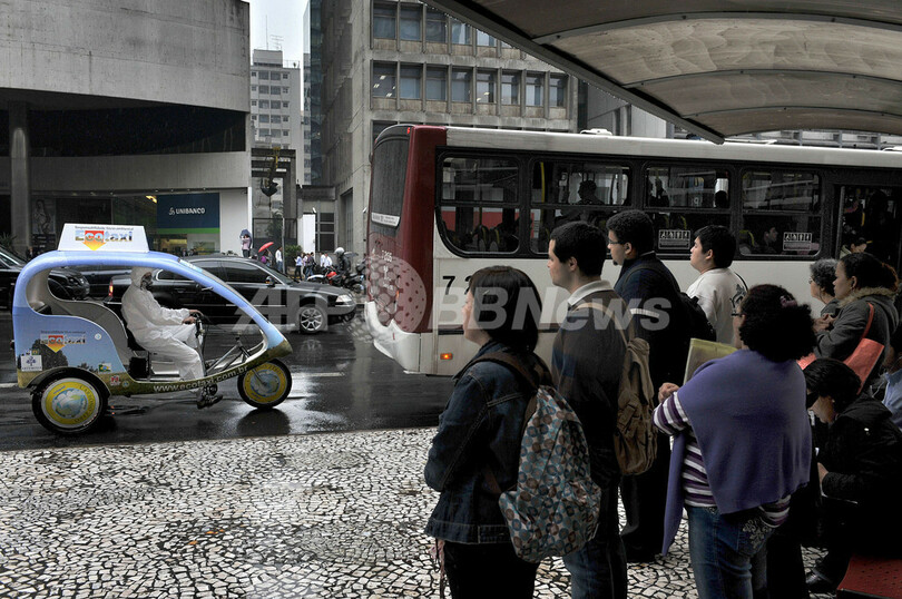 写真は、「カーフリーデー」のイベントで、ブラジル・サンパウロ(Sao Paulo)の金融地区パウリスタ大通り(Paulista Avenue)を二酸化炭素を排出しない屋根付き3輪自転車の試作車「エコタクシー(Eco-Taxi)」で走る環境保護活動家たちと、バスを待ちながらその様子を眺める人々(2009年9月22日撮影)。(c)AFP/Mauricio LIMA