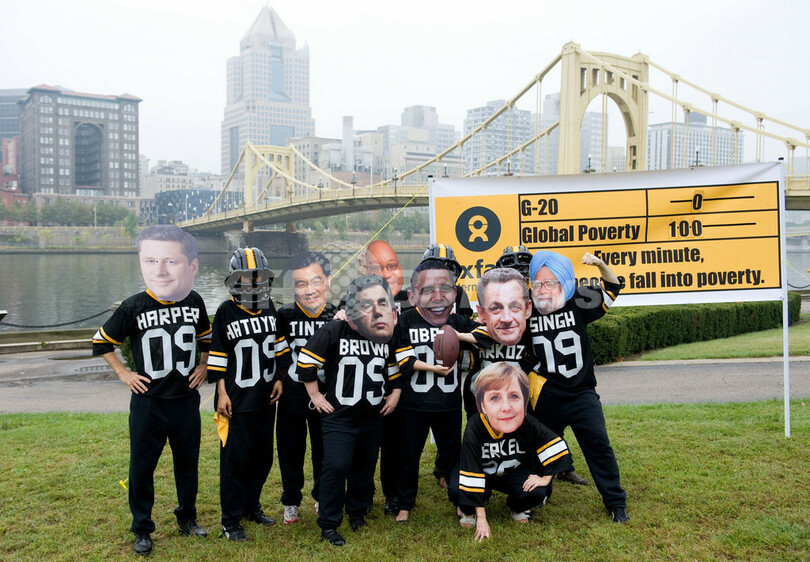 【9月25日 AFP】国際支援団体オックスファム(Oxfam)のメンバーは24日、主要20か国・地域(G20)首脳会議(金融サミット)が開催される米ペンシルベニア(Pennsylvania)州ピッツバーグ(Pittsburgh)のサミット会場付近で、アメリカンフットボールのユニフォームを着、バラク・オバマ(Barack Obama)米大統領をはじめサミットに参加している各国首脳のお面を付けて、G20が世界の貧困撲滅により大きな働きかけをするよう抗議するデモを行った。(c)AFP