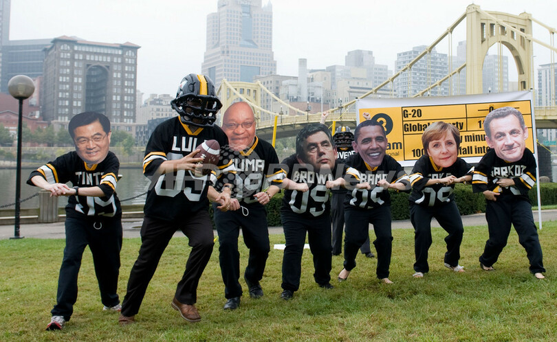 【9月25日 AFP】国際支援団体オックスファム(Oxfam)のメンバーは24日、主要20か国・地域(G20)首脳会議(金融サミット)が開催される米ペンシルベニア(Pennsylvania)州ピッツバーグ(Pittsburgh)のサミット会場付近で、アメリカンフットボールのユニフォームを着、バラク・オバマ(Barack Obama)米大統領をはじめサミットに参加している各国首脳のお面を付けて、G20が世界の貧困撲滅により大きな働きかけをするよう抗議するデモを行った。(c)AFP