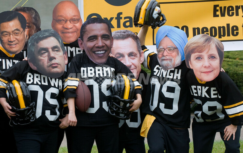 【9月25日 AFP】国際支援団体オックスファム(Oxfam)のメンバーは24日、主要20か国・地域(G20)首脳会議(金融サミット)が開催される米ペンシルベニア(Pennsylvania)州ピッツバーグ(Pittsburgh)のサミット会場付近で、アメリカンフットボールのユニフォームを着、バラク・オバマ(Barack Obama)米大統領をはじめサミットに参加している各国首脳のお面を付けて、G20が世界の貧困撲滅により大きな働きかけをするよう抗議するデモを行った。(c)AFP