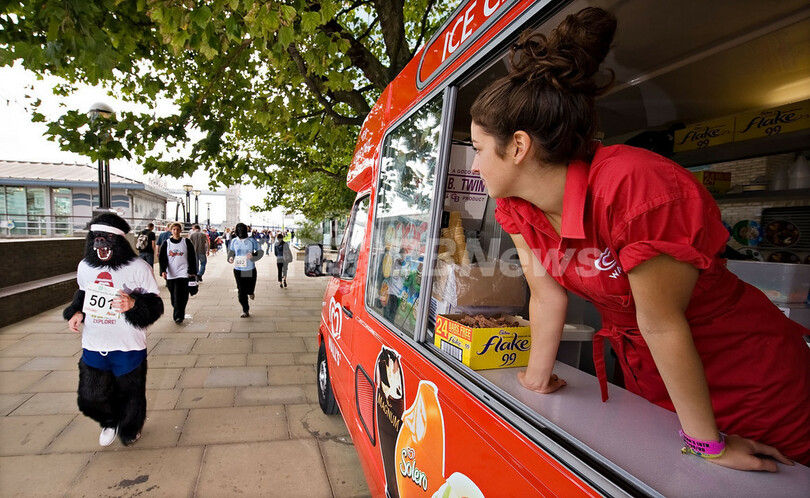 ニュース ライフ ロンドン金融街を駆け抜けるゴリラの集団、「グレート・ゴリラ・ラン」 2009年9月27日 9:58 発信地:ロンドン/英国 [ ヨーロッパ 英国 ] このニュースをシェア ‹ › ❮ 9/9 ❯ ロンドン(London)で26日、ゴリラの着ぐるみを着て市内の7キロのコースを走る「グレート・ゴリラ・ラン(Great Gorilla Run)」が開催された。アフリカで地域に根ざした雇用と教育を住民に提供することを通じてゴリラの生息地を守る活動をしている団体「Gorilla Organisation」が企画した資金集めのためのイベントだ。写真は「グレート・ゴリラ・ラン」の参加者が走る様子を眺めるアイスクリーム販売店の店員(2009年9月26日撮影)。(c)AFP/Leon Neal 画像作成中 ! 【9月27日 AFP】ロンドン(London)で26日、ゴリラの着ぐるみを着て市内の7キロのコースを走る「グレート・ゴリラ・ラン(Great Gorilla Run)」が開催された。アフリカで地域に根ざした雇用と教育を住民に提供することを通じてゴリラの生息地を守る活動をしている団体「Gorilla Organisation」が企画した資金集めのためのイベントだ。(c)AFP ライフ 一覧へ> メディア・報道関係・法人の方向け 写真・動画 購入のお問合せ>