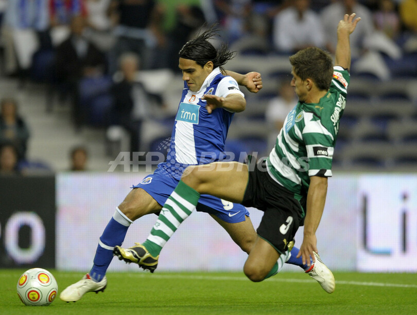 09-10ポルトガル1部リーグ第6節、FCポルト(%%FC Porto%%)対スポルティング・リスボン(%%Sporting Lisbon%%)。試合はポルトが1-0で勝利した。写真はダニエル・カリソ(%%Daniel Carrico%%)のスライディングを受けるポルトのラダメル・ファルカオ・ガルシア(%%Radamel Falcao Garcia%%、左)。(2009年9月26日撮影)(c)AFP/MIGUEL RIOPA