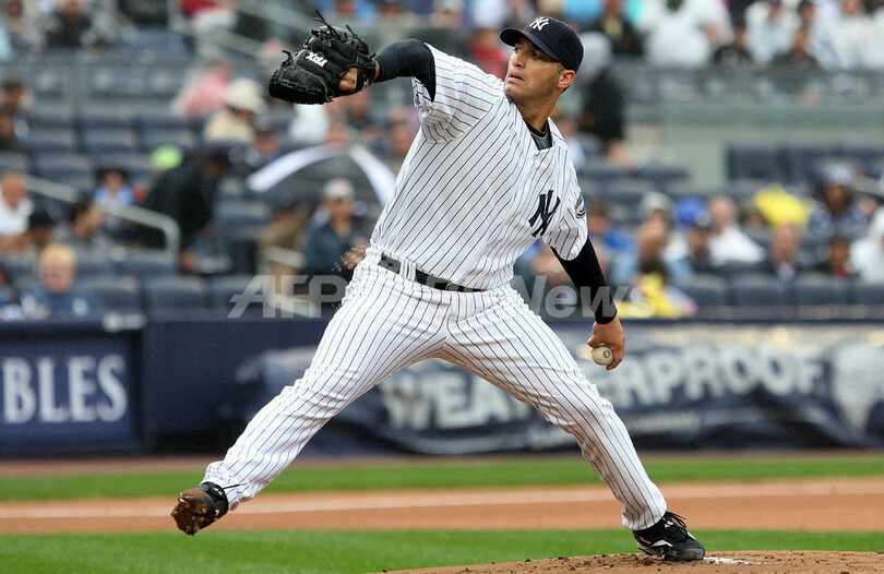 すでにプレーオフ出場を決めていたヤンキースは、6回に松井秀喜(%%Hideki Matsui%%)の2点適時打で逆転すると、最後は守護神のマリアーノ・リベラ(%%Mariano Rivera%%)が締めくくりシーズン100勝目を挙げ、2006年以来の地区優勝を果たした。写真は先発登板し、6回を2失点に抑えてシーズン14勝目を挙げたヤンキースのアンディ・ペティット(%%Andy Pettitte%%)。(2009年9月27日撮影)(c)AFP/Getty Images/Jim McIsaac