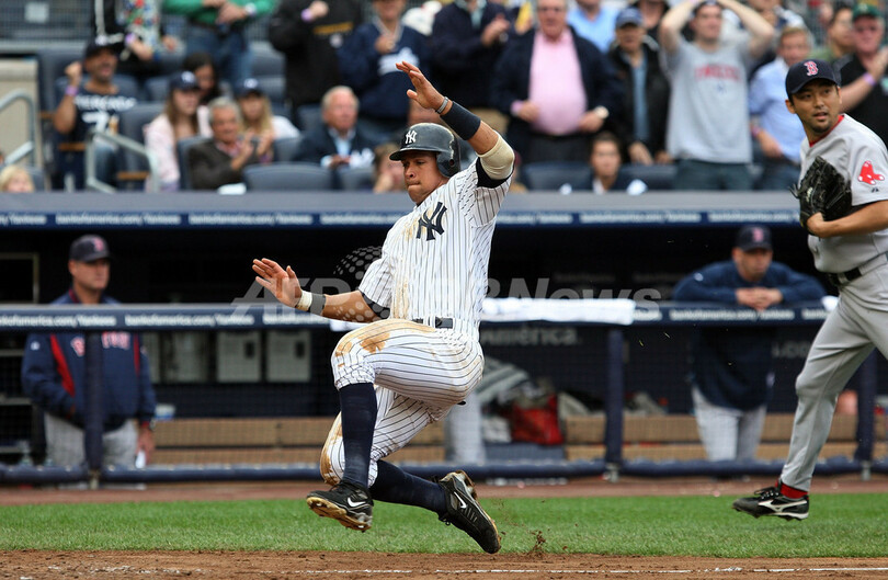 すでにプレーオフ出場を決めていたヤンキースは、6回に松井秀喜(%%Hideki Matsui%%)の2点適時打で逆転すると、最後は守護神のマリアーノ・リベラ(%%Mariano Rivera%%)が締めくくりシーズン100勝目を挙げ、2006年以来の地区優勝を果たした。写真は6回に松井秀喜(%%Hideki Matsui%%)の適時打で本塁に生還するヤンキースのアレックス・ロドリゲス(%%Alex Rodriguez%%)。(2009年9月27日撮影)(c)AFP/Getty Images/Jim McIsaac