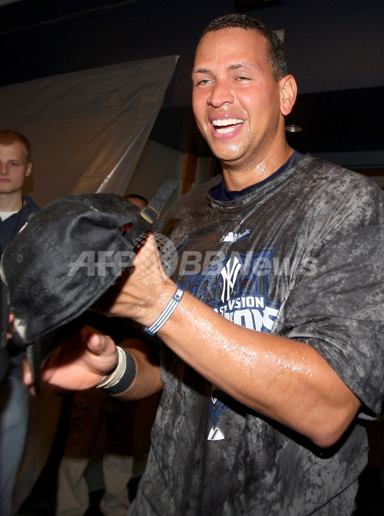 すでにプレーオフ出場を決めていたヤンキースは、6回に松井秀喜(%%Hideki Matsui%%)の2点適時打で逆転すると、最後は守護神のマリアーノ・リベラ(%%Mariano Rivera%%)が締めくくりシーズン100勝目を挙げ、2006年以来の地区優勝を果たした。写真は地区優勝を決めてシャンパンファイトをするヤンキースのアレックス・ロドリゲス(%%Alex Rodriguez%%)。(2009年9月27日撮影)(c)AFP/Getty Images/Jim McIsaac