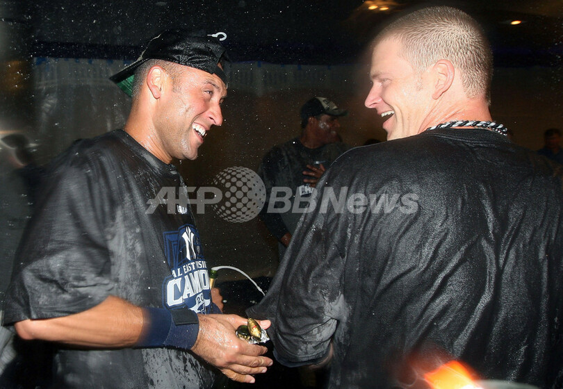 すでにプレーオフ出場を決めていたヤンキースは、6回に松井秀喜(%%Hideki Matsui%%)の2点適時打で逆転すると、最後は守護神のマリアーノ・リベラ(%%Mariano Rivera%%)が締めくくりシーズン100勝目を挙げ、2006年以来の地区優勝を果たした。写真は地区優勝を決めてクラブハウスで喜びを分かちあうヤンキースのデレク・ジーター(%%Derek Jeter%%)とAJ・バーネット(%%A.J. Burnett%%、右)。(2009年9月27日撮影)(c)AFP/Getty Images/Jim McIsaac