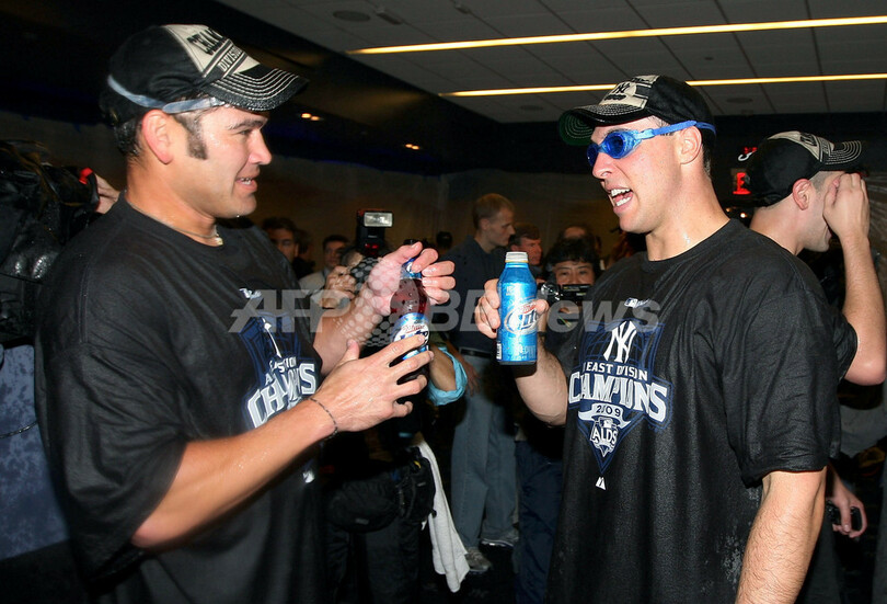 すでにプレーオフ出場を決めていたヤンキースは、6回に松井秀喜(%%Hideki Matsui%%)の2点適時打で逆転すると、最後は守護神のマリアーノ・リベラ(%%Mariano Rivera%%)が締めくくりシーズン100勝目を挙げ、2006年以来の地区優勝を果たした。写真は地区優勝を決めてクラブハウスで喜びを分かちあうヤンキースのマーク・テシェーラ(%%Mark Teixeira%%、右)とジョニー・デーモン(%%Johnny Damon%%)。(2009年9月27日撮影)(c)AFP/Getty Images/Jim McIsaac
