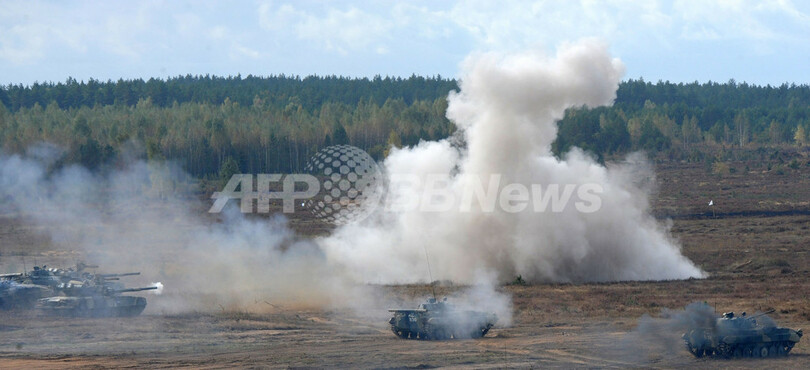写真は、Obuz-Lesnovskyの射撃練習場で行われたロシア・ベラルーシ合同軍事演習「West-2009」に参加するロシアの戦車と装甲車(2009年9月29日撮影)。(c)AFP/VIKTOR DRACHEV