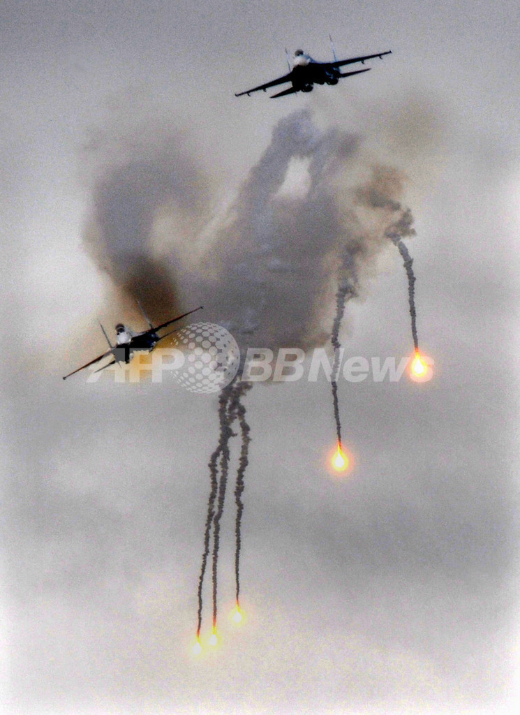 写真は、Obuz-Lesnovskyの射撃練習場で行われたロシア・ベラルーシ合同軍事演習「West-2009」に参加するロシア軍戦闘機「Su-27」(2009年9月29日撮影)。(c)AFP/VIKTOR DRACHEV