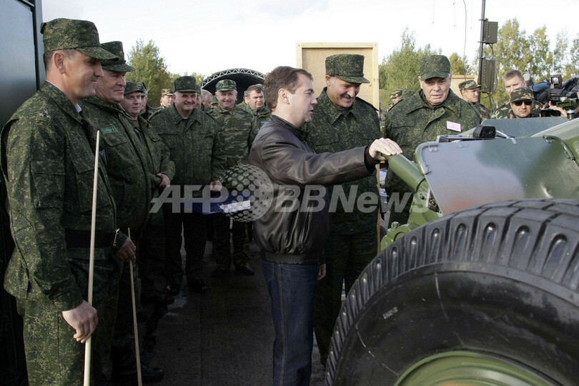 写真は、Obuz-Lesnovskyの射撃練習場で行われたロシア・ベラルーシ合同軍事演習「West-2009」で、軍事装備を視察するドミトリー・メドベージェフ(Dmitry Medvedev)ロシア大統領(中央左)とアレクサンドル・ルカシェンコ(Alexander Lukashenko)ベラルーシ大統領(中央右、2009年9月29日撮影)。(c)AFP/RIA NOVOSTI/KREMLIN POOL/VLADIMIR RODIONOV