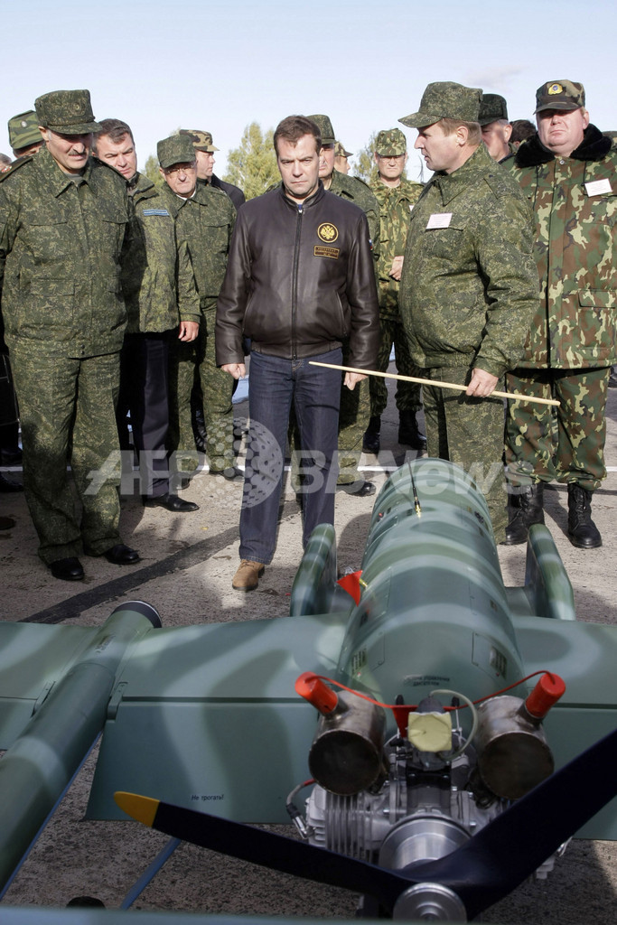 写真は、Obuz-Lesnovskyの射撃練習場で行われたロシア・ベラルーシ合同軍事演習「West-2009」で、軍事装備を視察するドミトリー・メドベージェフ(Dmitry Medvedev)ロシア大統領(中央)とアレクサンドル・ルカシェンコ(Alexander Lukashenko)ベラルーシ大統領(左、2009年9月29日撮影)。(c)AFP/RIA NOVOSTI/KREMLIN POOL/VLADIMIR RODIONOV