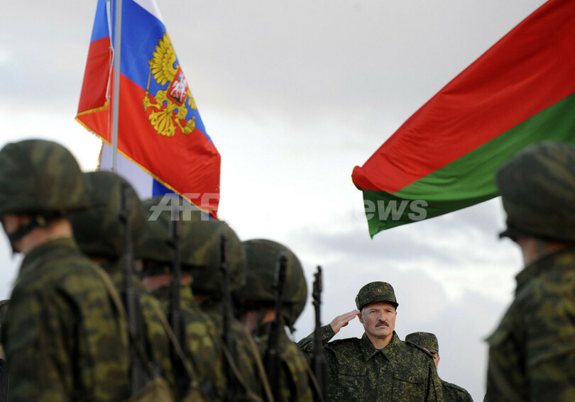 写真は、Obuz-Lesnovskyの射撃練習場で行われたロシア・ベラルーシ合同軍事演習「West-2009」で、兵士の行進に向かって敬礼するアレクサンドル・ルカシェンコ(Alexander Lukashenko)ベラルーシ大統領(2009年9月29日撮影)。(c)AFP/VIKTOR DRACHEV