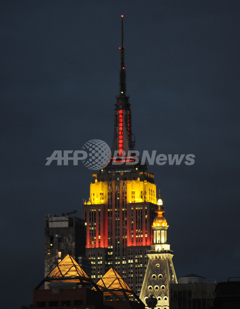 中国建国60周年を記念して赤と黄色でライトアップされた、ニューヨーク(New York)のエンパイアステートビル(Empire State Building、2009年9月30日撮影)。(c)AFP/Stan HONDA