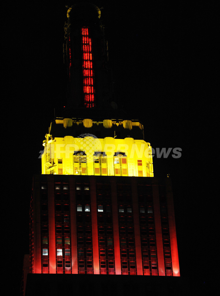 【10月1日 AFP】ニューヨーク(New York)のエンパイアステートビル(Empire State Building)が30日、中国建国60周年を記念して、赤と黄色でライトアップされた。(c)AFP
