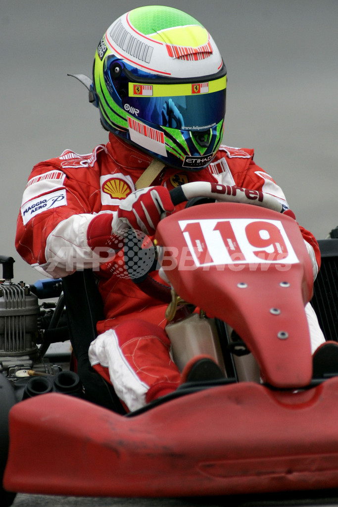 第10戦ハンガリーGP(Hungarian Grand Prix 2009)での事故からの回復を見せているマッサは1日、サンパウロ(Sao Paolo)のカート用コースでピケと手短に落ち着いた挨拶を交わしていた。(c)AFP