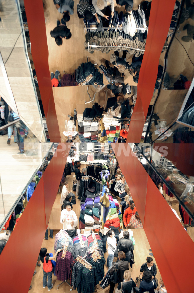 写真は、パリにオープンしたカジュアル衣料ユニクロのパリ・オペラ店の店内(2009年10月1日撮影)。(c)AFP/ERIC PIERMONT