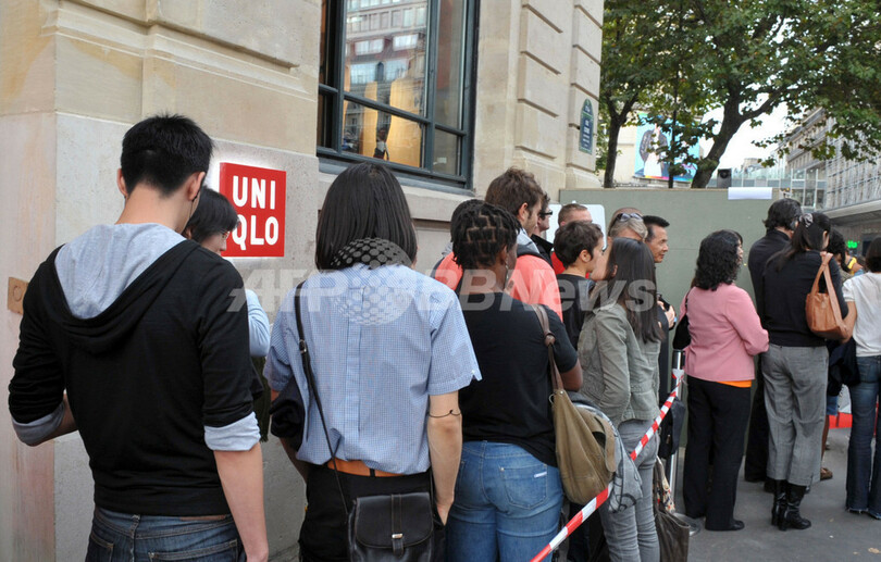 写真は、パリにオープンしたカジュアル衣料ユニクロの「パリ・オペラ店」の入り口前に行列を作る人たち(2009年10月1日撮影)。(c)AFP/ERIC PIERMONT