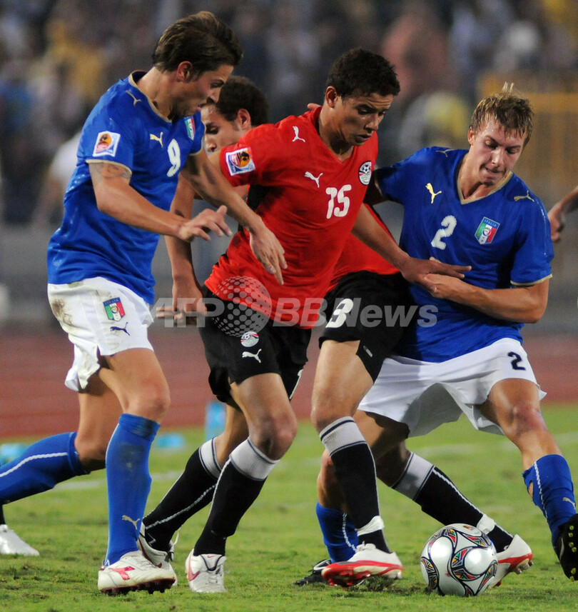 スポーツ サッカー 開催国エジプト イタリア破り決勝トーナメント進出、U20W杯 2009年10月2日 15:20 発信地:カイロ/エジプト [ 中東・北アフリカ エジプト ] このニュースをシェア ‹ › ❮ 1/5 ❯ サッカーU20W杯2009、1次リーグA組、イタリア対エジプト。イタリアのウンベルト・エウセピ(%%Umberto Eusepi%%、左)とアレッサンドロ・クレシェンツィ(%%Alessandro Crescenzi%%、右)のチェックを受けるエジプトのサアデルディン・サアド(%%Saadeldin Saad%%)。(2009年10月1日撮影)(c)AFP/AMR AHMAD 画像作成中 ! 【10月2日 AFP】サッカーU20W杯2009(U-20 World Cup 2009)1次リーグA組、イタリア対エジプト。試合はエジプトが4-2で勝利し、勝ち点を6に伸ばしてA組首位での決勝トーナメント進出を決めた。(c)AFP サッカー 一覧へ> メディア・報道関係・法人の方向け 写真・動画 購入のお問合せ>