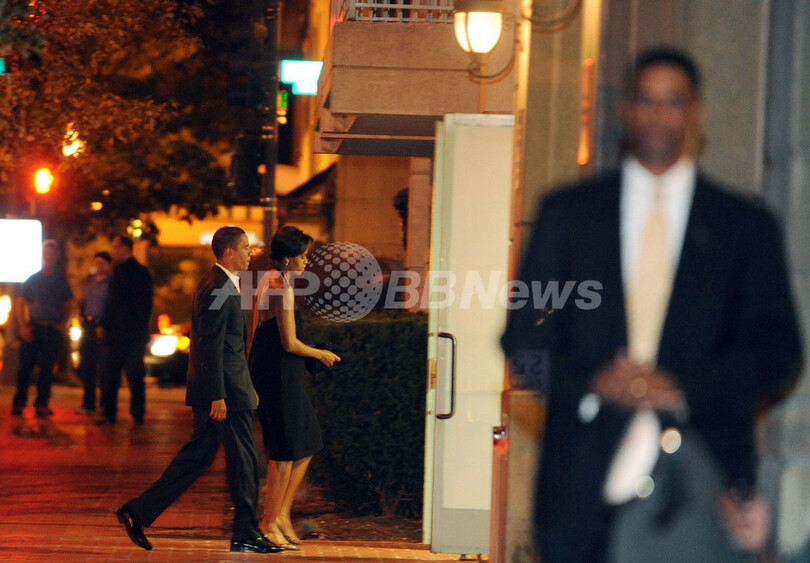 バラク・オバマ(Barack Obama)大統領夫妻は3日夜、ワシントンD.C.(Washington D.C.)にあるレストラン「ブルー・ダック・タバーン(Blue Duck Tavern)」で17回目の結婚記念日を祝った。写真は同店に入るオバマ大統領とミシェル・オバマ(Michelle Obama)夫人(2009年10月3日撮影)。(c)AFP/Jewel SAMAD