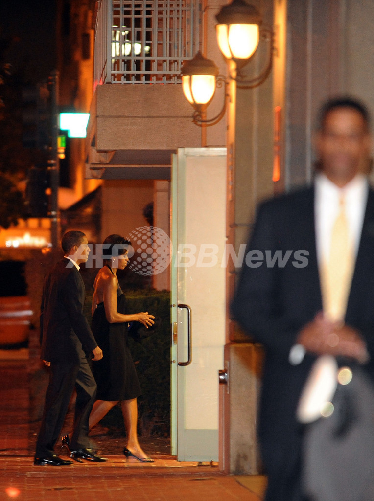 バラク・オバマ(Barack Obama)大統領夫妻は3日夜、ワシントンD.C.(Washington D.C.)にあるレストラン「ブルー・ダック・タバーン(Blue Duck Tavern)」で17回目の結婚記念日を祝った。写真は同店に入るオバマ大統領とミシェル・オバマ(Michelle Obama)夫人(2009年10月3日撮影)。(c)AFP/Jewel SAMAD