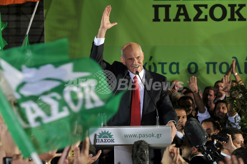 【10月5日 AFP】ギリシャ議会(一院制、定数300)選挙の投開票が4日行われ、中道左派野党・全ギリシャ社会主義運動(PASOK)のヨルギオス・パパンドレウ(George Papandreou)党首(57)が勝利宣言をおこなった。