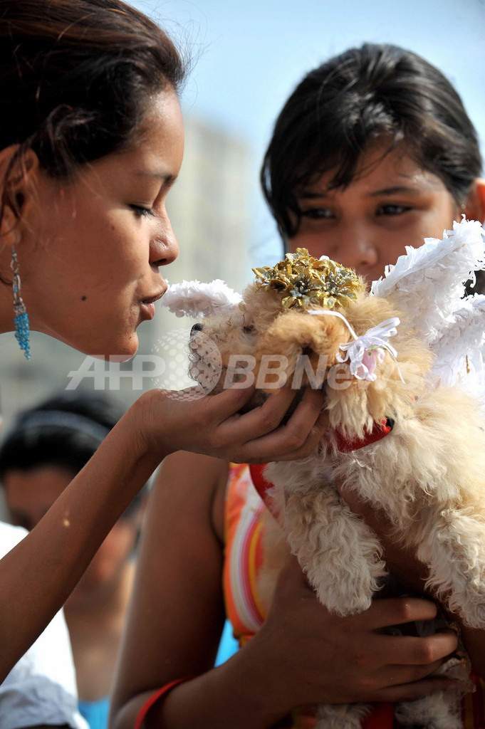 「世界動物デー」は1931年、絶滅に瀕した動物たちの保護を訴える目的でに設立された。10月4日は、キリスト教で動物たちの守護聖人として知られるアッシジの聖フランシス(St. Francis of Assisi)の命日の翌日にあたる。写真はカリで、天使の衣装を身に着けたイヌに口づけする少女(2009年10月4日撮影)。(c)AFP/Luis ROBAYO