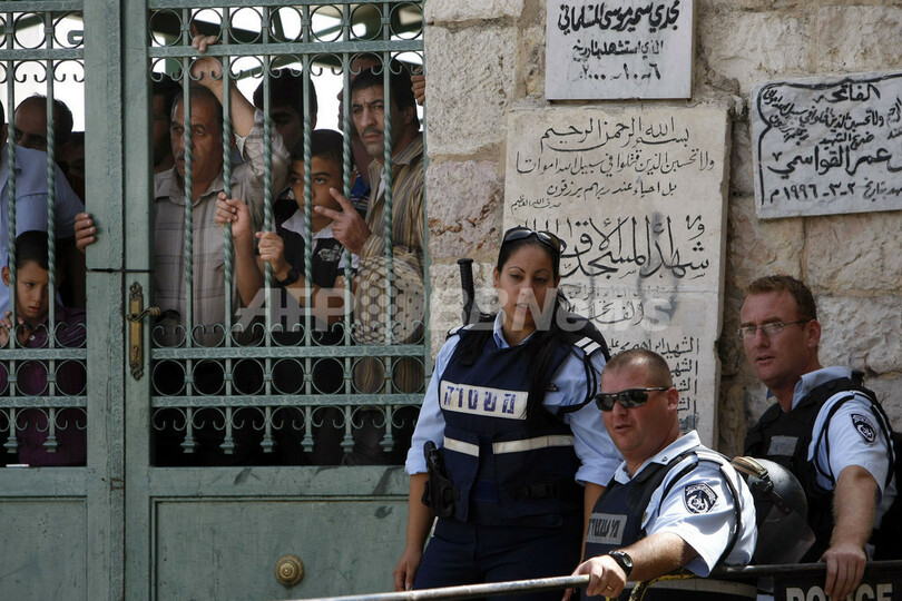 目撃者によると、この放送は、イスラエル当局が現在行われているユダヤ教の祭り「仮庵祭(スコット、Sukkot)」の期間中に、同モスクへのユダヤ人入植者の立ち入りを許可するとのうわさが広まったことを受けて行われたものだという。(c)AFP/Joseph Krauss