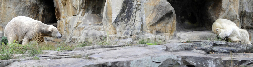 ベルリン動物園(Berlin Zoo)の人気者、ホッキョクグマのクヌート(Knut、左)と、同居を始めた恋人候補のジャンナ(Gianna、2009年10月2日撮影)。(c)AFP/DDP/ BERTHOLD STADLER
