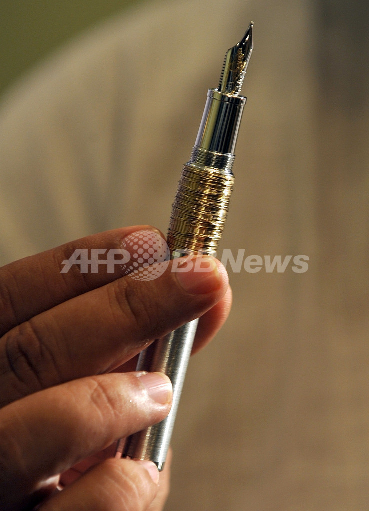 この万年筆はガンジー生誕140周年を記念し、前週ムンバイ(Mumbai)でモンブランが発表した限定品で、価格は2万8000ドル(約250万円)。白金とロジウムのプレーティングが施されている。