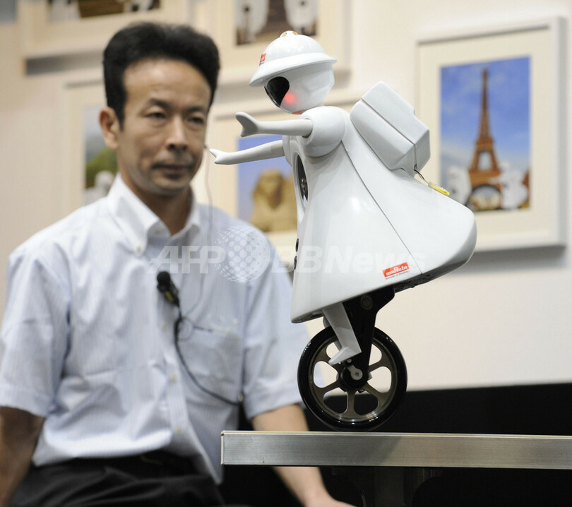 【10月6日 AFP】村田製作所(Murata Manufacturing)は6日、千葉・幕張メッセで開幕したアジア最大の最先端IT・エレクトロニクス総合展「CEATEC JAPAN(シーテックジャパン)2009」で、一輪車型ロボット「ムラタセイコちゃん(Murata-seiko-chan)」2009年モデルを公開した。高さ50センチ、重さ6キロの「ムラタセイコちゃん」は、前進や後退する際にバランスを維持するジャイロセンサーなど、さまざまなセンサーを内蔵している。(c)AFP