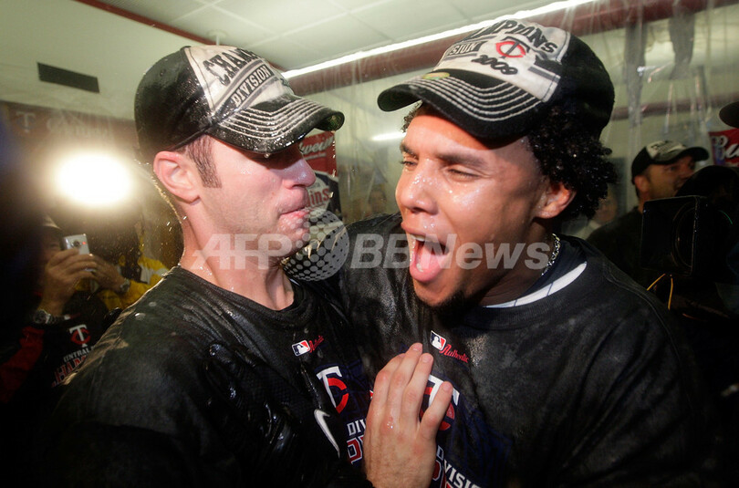 ツインズは、ア・リーグ地区シリーズで東地区を制したニューヨーク・ヤンキース(%%New York Yankees%%)と対戦する。同シリーズは7日、ヤンキースの本拠地ヤンキースタジアム(Yankee Stadium)で開幕を迎える。写真は地区優勝を決め、ロッカールームでシャンパンをかけ合うツインズのカルロス・ゴメス(%%Carlos Gomez%%、右)とジョー・モウアー(%%Joe Mauer%%)。(2009年10月6日撮影)(c)AFP/Getty Images/Jamie Squire