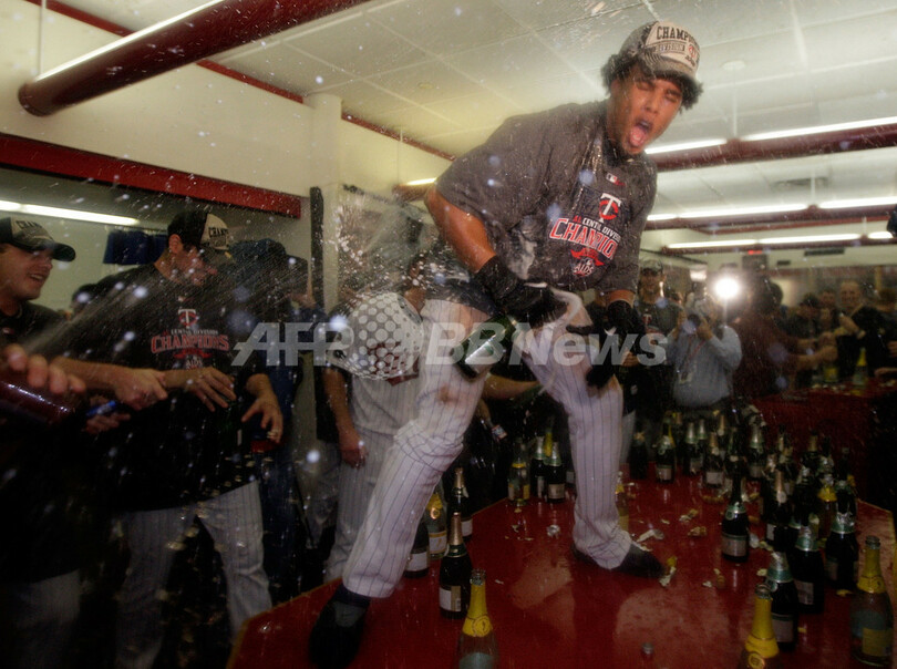 ツインズは、ア・リーグ地区シリーズで東地区を制したニューヨーク・ヤンキース(%%New York Yankees%%)と対戦する。同シリーズは7日、ヤンキースの本拠地ヤンキースタジアム(Yankee Stadium)で開幕を迎える。写真は地区優勝を決め、ロッカールームでシャンパンを振るツインズのカルロス・ゴメス(%%Carlos Gomez%%)。(2009年10月6日撮影)(c)AFP/Getty Images/Jamie Squire