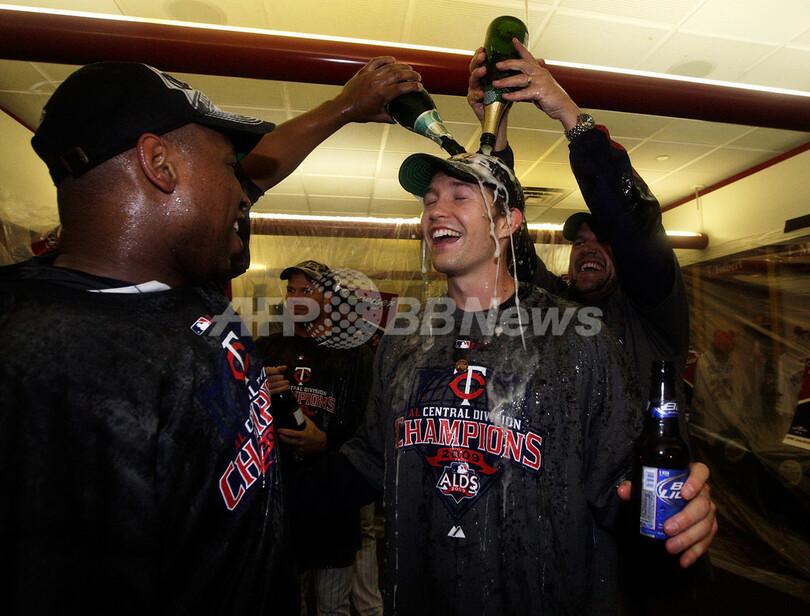 ツインズは、ア・リーグ地区シリーズで東地区を制したニューヨーク・ヤンキース(%%New York Yankees%%)と対戦する。同シリーズは7日、ヤンキースの本拠地ヤンキースタジアム(Yankee Stadium)で開幕を迎える。写真は地区優勝を決め、ロッカールームでシャンパンをかけ合うツインズのスコット・ベーカー(%%Scott Baker%%)。(2009年10月6日撮影)(c)AFP/Getty Images/Jamie Squire
