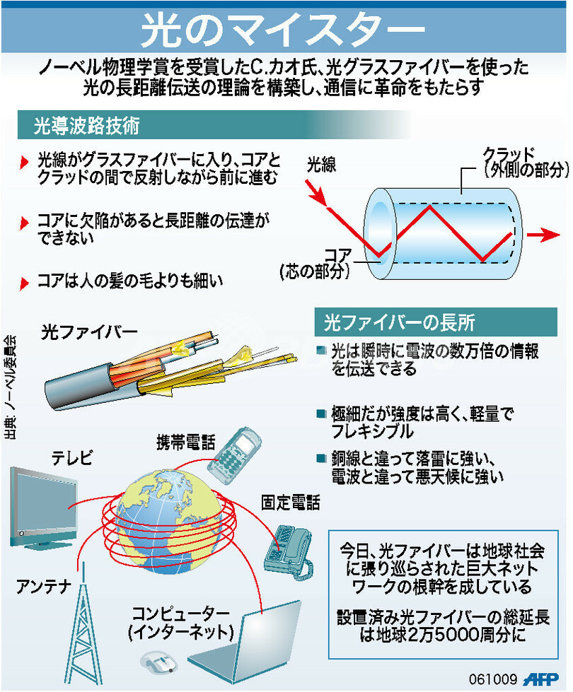 ニュース 環境・科学 図解 【図解】光ファイバーを使った光の長距離伝送の理論 2009年10月7日 13:55 発信地:パリ/フランス [ ヨーロッパ フランス ] このニュースをシェア (c)AFP 【10月7日 AFP】図は、2009年のノーベル物理学賞(Nobel Physics Prize)を受賞した香港中文大学(Chinese University of Hong Kong)の元学長チャールズ・カオ(Charles Kao)氏(75)の、「光ファイバーを使った光の長距離伝送の理論」を示したもの。(c)AFP<ニュース解説画像一覧へ> 環境・科学 一覧へ> メディア・報道関係・法人の方向け 写真・動画 購入のお問合せ>