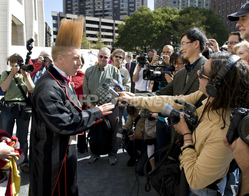 米ニューヨーク(New York)のリンカーン・センター(Lincoln Center)で6日、サーカス団「ビッグ・アップル・サーカス(Big Apple Circus)」の団員ベロ・ノック(Bello Nock)さんが、噴水の上に張られた綱を渡るという曲芸に挑戦し、見事成功した。同サーカス団は22日から2010年1月18日までリンカーン・センターで公演を行う。写真は、チャレンジ前に報道陣のインタビューに応じるノックさん(2009年10月6日撮影)。(c)AFP/DON EMMERT