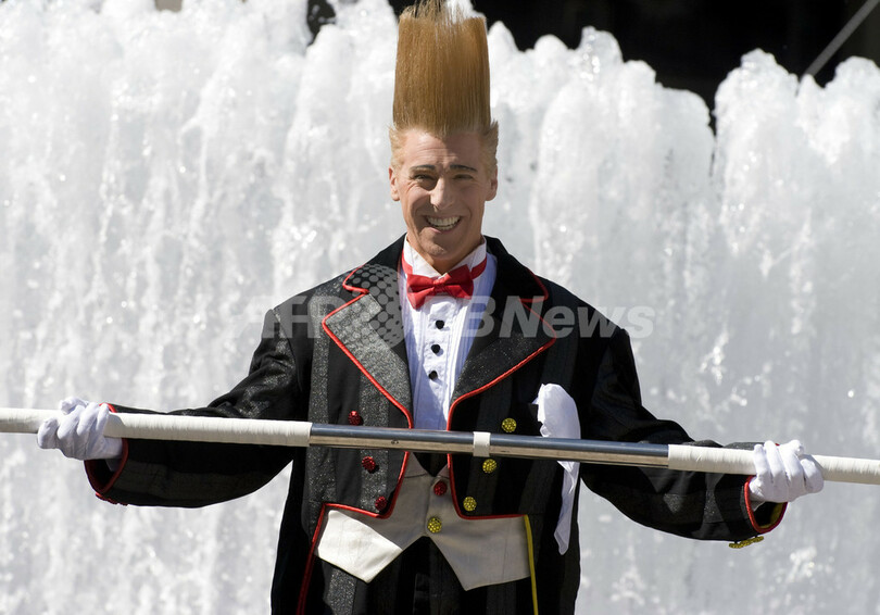 Bello Nock)さんが、噴水の上に張られた綱を渡るという曲芸に挑戦し、見事成功した。同サーカス団は22日から2010年1月18日まで同地で公演を行う。(c)AFP