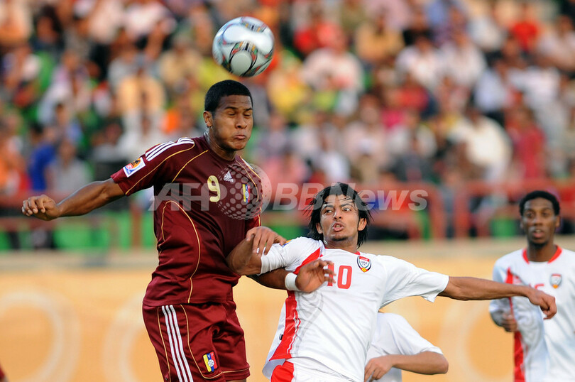 スポーツ サッカー UAE ベネズエラに勝利し準々決勝進出、U20W杯 2009年10月8日 8:15 発信地:スエズ/エジプト [ 中東・北アフリカ エジプト ] このニュースをシェア ‹ › ❮ 9/10 ❯ サッカーU20W杯2009(%%U-20 World Cup 2009%%)決勝トーナメント1回戦、ベネズエラ対アラブ首長国連邦(UAE)。試合はUAEが2-1で勝利し、準々決勝に進出した。写真はUAEのテヤブ・アワナ(%%Theyab Awana%%)に競り勝ち、ボールをヘディングするベネズエラのホセ・ロンドン(%%Jose Rondon%%)。(2009年10月7日撮影)(c)AFP/KHALED DESOUKI 画像作成中 ! 【10月8日 AFP】サッカーU20W杯2009(U-20 World Cup 2009)決勝トーナメント1回戦、ベネズエラ対アラブ首長国連邦(UAE)。試合はUAEが2-1で勝利し、準々決勝に進出した。(c)AFP サッカー 一覧へ> メディア・報道関係・法人の方向け 写真・動画 購入のお問合せ>