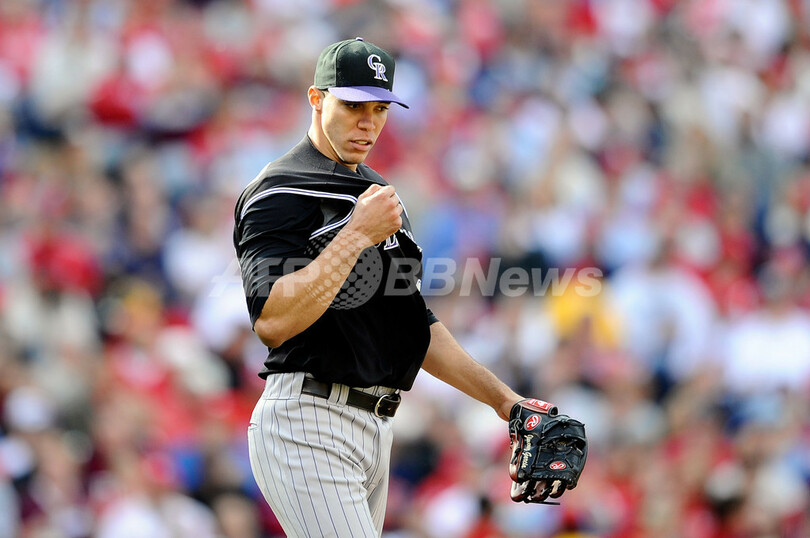 フィリーズは先発登板したクリフ・リー(%%Cliff Lee%%)が、ロッキーズ打線を6安打1得点に抑えて完投し、プレーオフ初戦を白星で飾った。リーは9回、二死までロッキーズに得点を許さなかった。写真は先発登板し、9安打5失点を喫し6回途中で降板したロッキーズのウバルド・ヒメネス(%%Ubaldo Jimenez%%)。(2009年10月7日撮影)(c)AFP/Getty Images/Jeff Zelevansky
