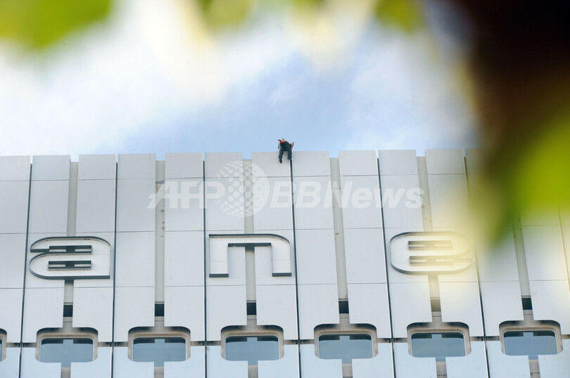 写真はパリ(Paris)近郊のラ・デファンス(La Defense)地区にある高層ビルの1つ、Arianeの壁面を登りビルの頂上に立ったアラン・ロベール(Alain Robert)さん(2009年10月8日撮影)。(c)AFP/BORIS HORVAT