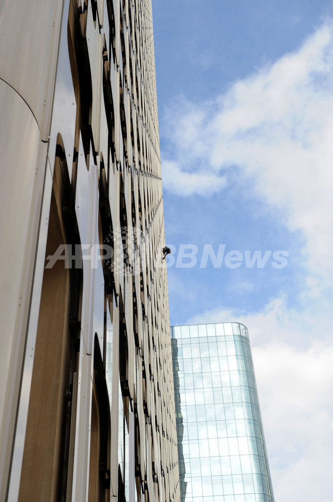写真はパリ(Paris)近郊のラ・デファンス(La Defense)地区にある高層ビルの1つ、Arianeの壁面を登るアラン・ロベール(Alain Robert)さん(2009年10月8日撮影)。(c)AFP/BORIS HORVAT
