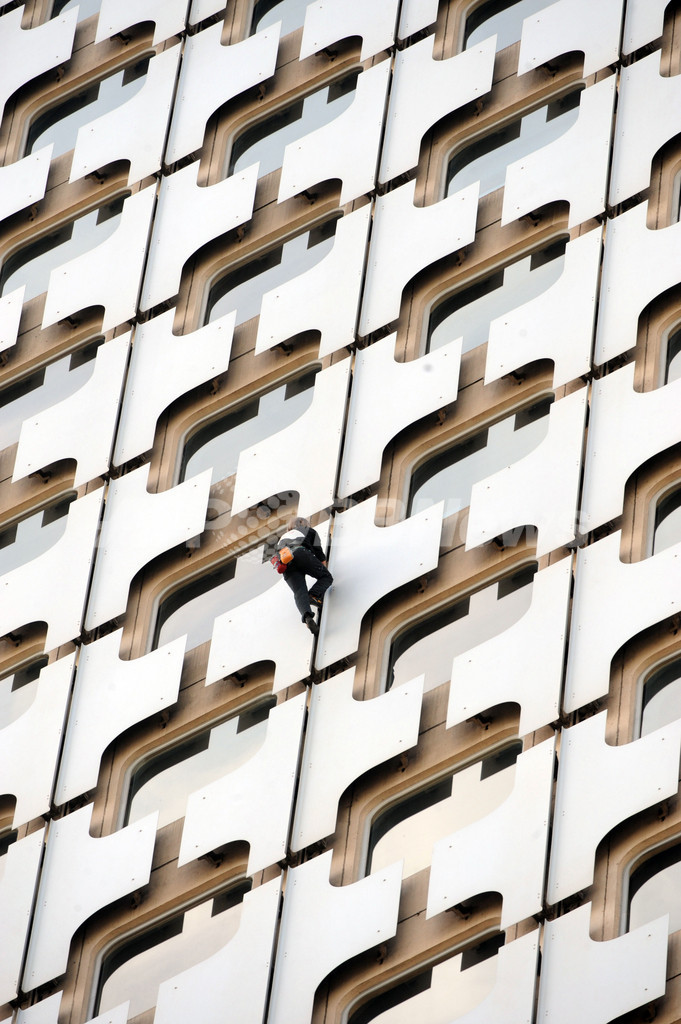 写真はパリ(Paris)近郊のラ・デファンス(La Defense)地区にある高層ビルの1つ、Arianeの壁面を登っているアラン・ロベール(Alain Robert)さん(2009年10月8日撮影)。(c)AFP/BORIS HORVAT