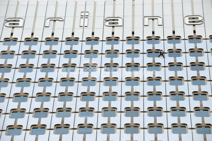 写真はパリ(Paris)近郊のラ・デファンス(La Defense)地区にある高層ビルの1つ、Arianeの壁面を登るアラン・ロベール(Alain Robert)さん(2009年10月8日撮影)。(c)AFP/BORIS HORVAT