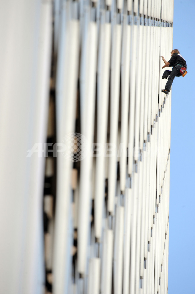 写真はパリ(Paris)近郊のラ・デファンス(La Defense)地区にある高層ビルの1つ、Arianeの壁面を登るアラン・ロベール(Alain Robert)さん(2009年10月8日撮影)。(c)AFP/BORIS HORVAT
