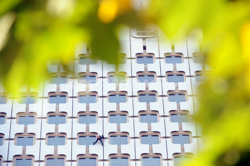 写真はパリ(Paris)近郊のラ・デファンス(La Defense)地区にある高層ビルの1つ、Arianeの壁面を登るアラン・ロベール(Alain Robert)さん(2009年10月8日撮影)。(c)AFP/BORIS HORVAT