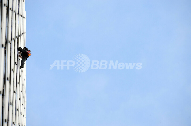 【10月9日 AFP】世界中の高層ビルを登り「スパイダーマン(Spiderman)」の異名を持つフランス人、アラン・ロベール(Alain Robert)さんが8日、パリ(Paris)近郊のラ・デファンス(La Defense)地区にある高層ビルの1つ、高さ230メートルのArianeの壁面を登った。ロベールさんがビルの壁を登り始めたのは11歳の時。以来、世界各地で60棟以上のビルに登っている。(c)AFP