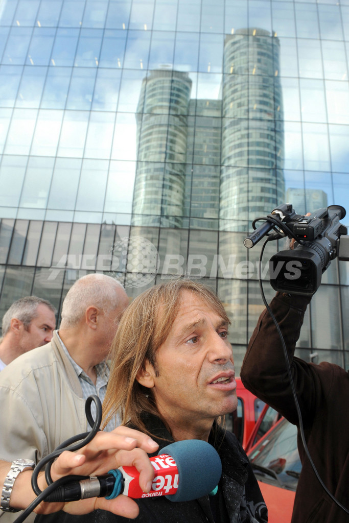 写真はパリ(Paris)近郊のラ・デファンス(La Defense)地区にある高層ビルの1つ、Arianeの壁面を登り終え報道陣の質問に応えるアラン・ロベール(Alain Robert)さん(2009年10月8日撮影)。(c)AFP/BORIS HORVAT