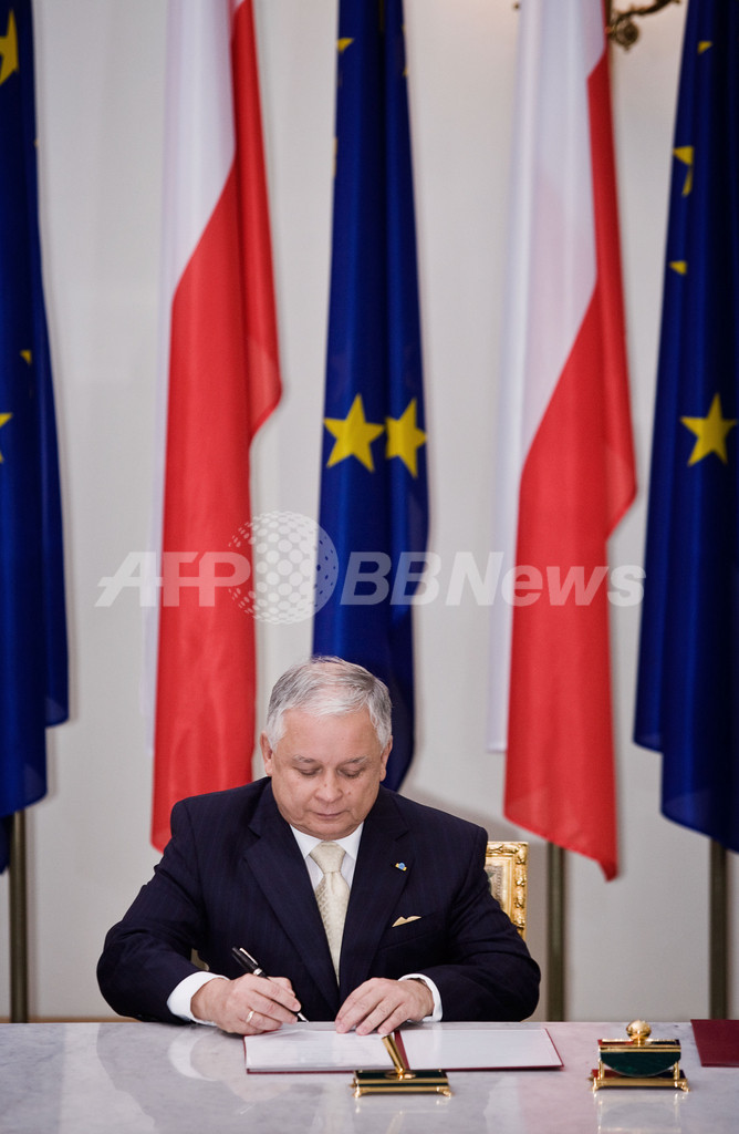 ニュース 政治・経済 ポーランド、リスボン条約批准 チェコ残すのみ 2009年10月10日 23:27 発信地:ワルシャワ/ポーランド [ ヨーロッパ ポーランド ] このニュースをシェア ‹ › ❮ 4/4 ❯ ポーランドの首都ワルシャワ(Warsaw)の大統領府で欧州連合(EU)の新基本条約「リスボン条約(Lisbon Treaty)」の批准書に署名するレフ・カチンスキ(Lech Kaczynski)ポーランド大統領(2009年10月10日撮影)。(c)AFP/WOJTEK RADWANSKI 画像作成中 ! 【10月10日 AFP】ポーランドのレフ・カチンスキ(Lech Kaczynski)大統領が10日、欧州連合(EU)の新基本条約「リスボン条約(Lisbon Treaty)」の批准書に署名した。これにより、同条約の未批准国はチェコだけとなった。(c)AFP 政治・経済 一覧へ> メディア・報道関係・法人の方向け 写真・動画 購入のお問合せ>