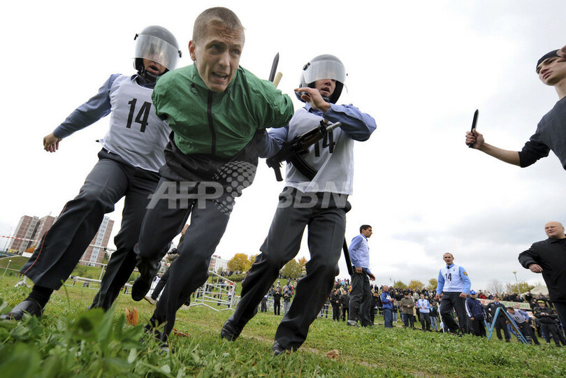ニュース 社会 ベラルーシで警察官の競技大会 2009年10月11日 18:59 発信地:ミンスク/ベラルーシ [ ロシア・CIS ベラルーシ ] このニュースをシェア ‹ › ❮ 6/6 ❯ ベラルーシ首都ミンスク(Minsk)で開かれた年に一度の警察官の競技大会で、犯人役を拘束する警察官(2009年10月10日撮影)。(c)AFP/VIKTOR DRACHEV 画像作成中 ! 【10月11日 AFP】ベラルーシの首都ミンスク(Minsk)で10日、年に一度の警察官の競技大会が開かれ、訓練を積んだ警察官や警察犬が逮捕術や負傷者を搬送する技術を競い合った。(c)AFP/VIKTOR DRACHEV 社会 一覧へ> メディア・報道関係・法人の方向け 写真・動画 購入のお問合せ>