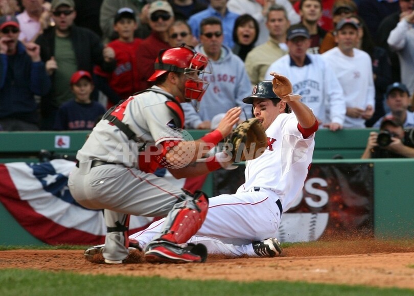 エンゼルスは9回二死、ボビー・アブレイユ(%%Bobby Abreu%%)の適時打二塁打とブラディミール・ゲレーロ(%%Vladimir Guerrero%%)の2点適時打で3点を挙げて逆転した。写真は3回、本塁に滑りこむレッドソックスのジャコビー・エルスバリー(%%Jacoby Ellsbury%%、右)。(2009年10月11日撮影)(c)AFP/Getty Images/Jim Rogash