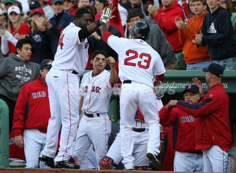 エンゼルスは9回二死、ボビー・アブレイユ(%%Bobby Abreu%%)の適時打二塁打とブラディミール・ゲレーロ(%%Vladimir Guerrero%%)の2点適時打で3点を挙げて逆転した。写真は8回、本塁に生還し、ダグアウトでデビッド・オーティス(%%David Ortiz%%、左)から祝福されるレッドソックスのジョーイ・ガスライト(%%Joey Gathright%%)。(2009年10月11日撮影)(c)AFP/Getty Images/Elsa
